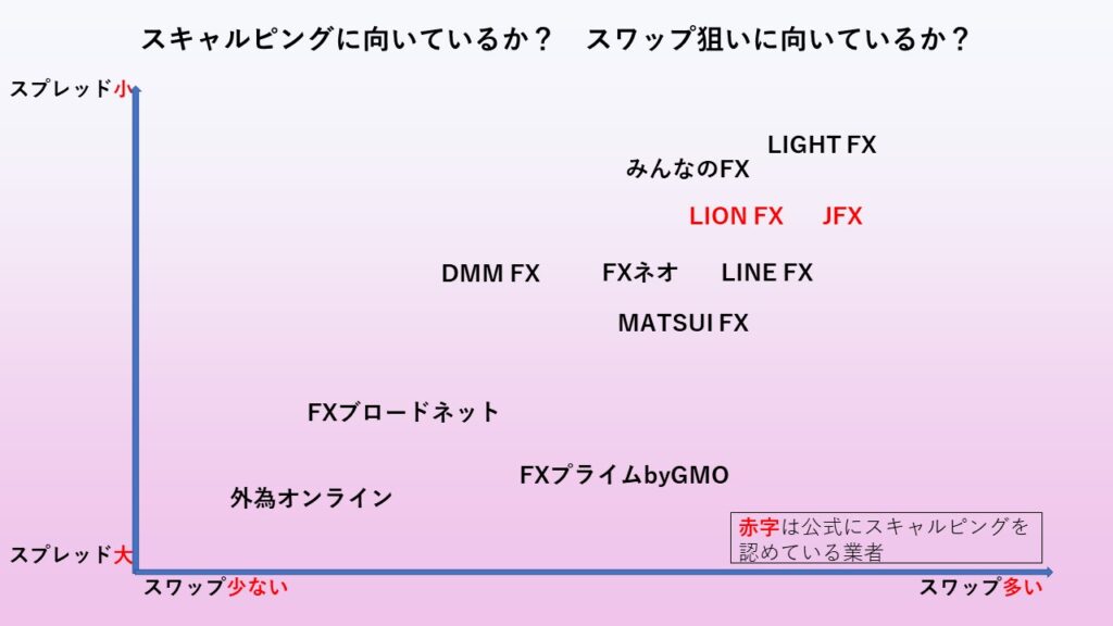 さらに上の表をもとに、チャートを作成しました。上に行くほどスプレッドが狭く、右に行くほどスワップポイントが多いということになります。この中から自分に向いている業者を選んでみてください。